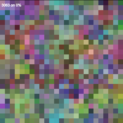 This is a simulation of dynamic equilibrium, with LOTS of colors. In this web-based visualization, you get to make a grid of colors and then watch them meld into each other until equilibrium is reached. But it's not "dynamic" until it's interactive; that's why you have the ability to paint with a brush. Watch your strokes fade into the background, or build borders that the colors have to travel around.